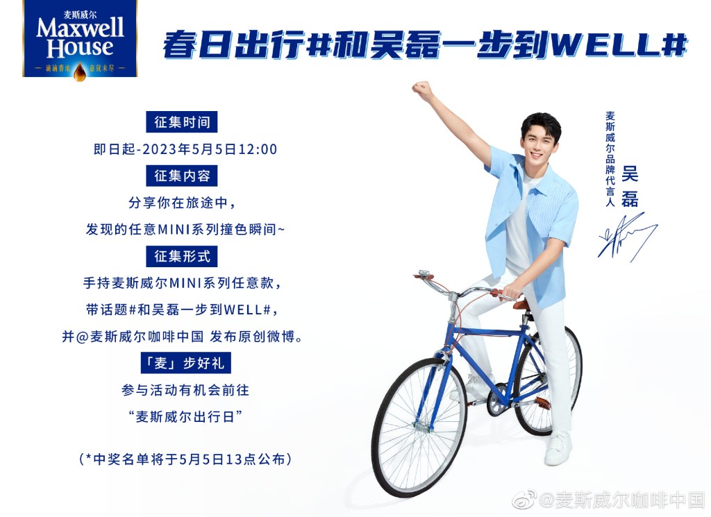 Endorsement 230424 [Photo] Wu Lei for Maxwell House ImageMay 13, 2023 WuLei GalaxyLeave a comment Share this: Click to share on X (Opens in new window) X Click to share on Facebook (Opens in new window) Facebook Like Loading... Related