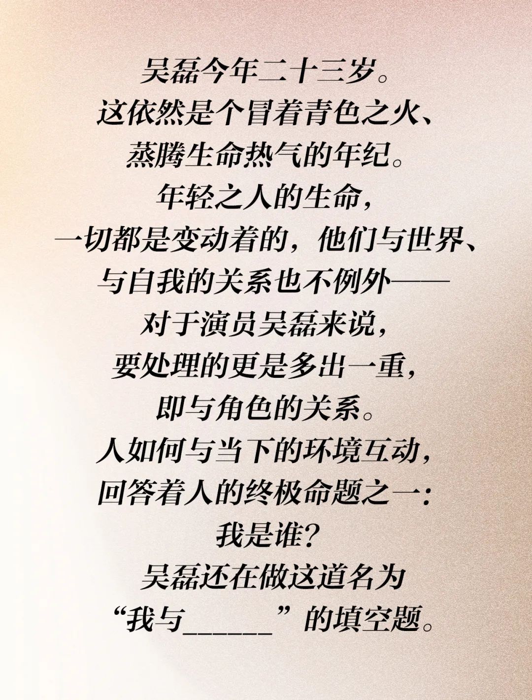 How does one interact with their current environment? How do they respond to their relationship with themselves and the world, themselves and their self? One of the ultimate propositions of the person who answers these questions is: Who am I? The currently flowing Wu Lei is still completing his own fill in the blank question.